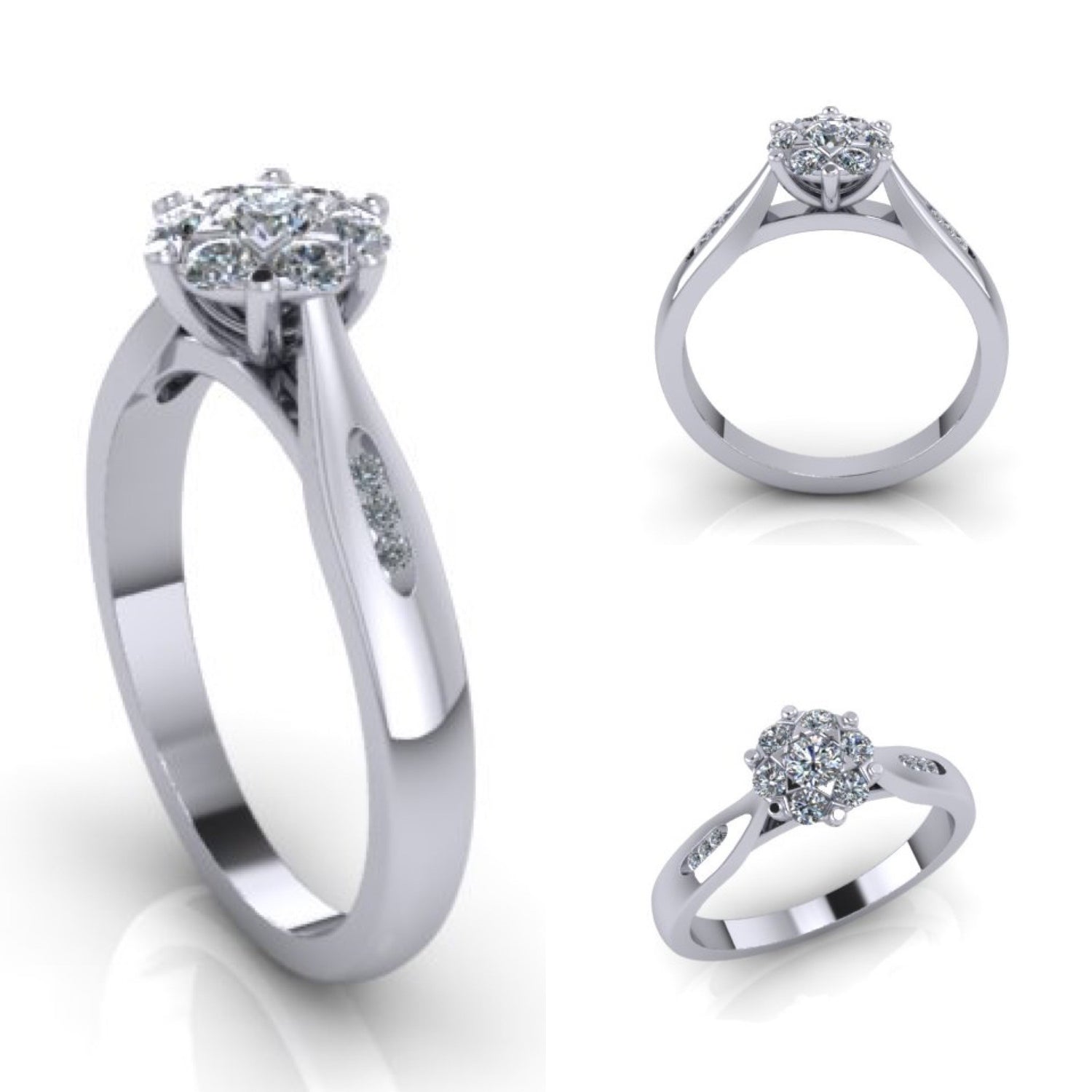 This ring was created using the customers existing ring to match the design and reuse the diamonds. The new ring was designed to be 'wedds fit', allowing a wedding band to fit along side the engagement ring perfectly due to the raised setting.