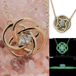 This is an example of a bespoke pendant designed and cast in 18k yellow gold. The centre stone is an old rose cut diamond taken from an engagement ring and made into a Celtic knot pendant.