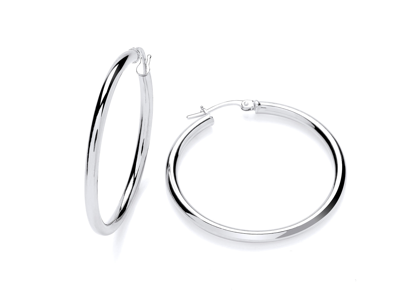 A pair of 9ct white gold 30mm hoops in a polished finish.