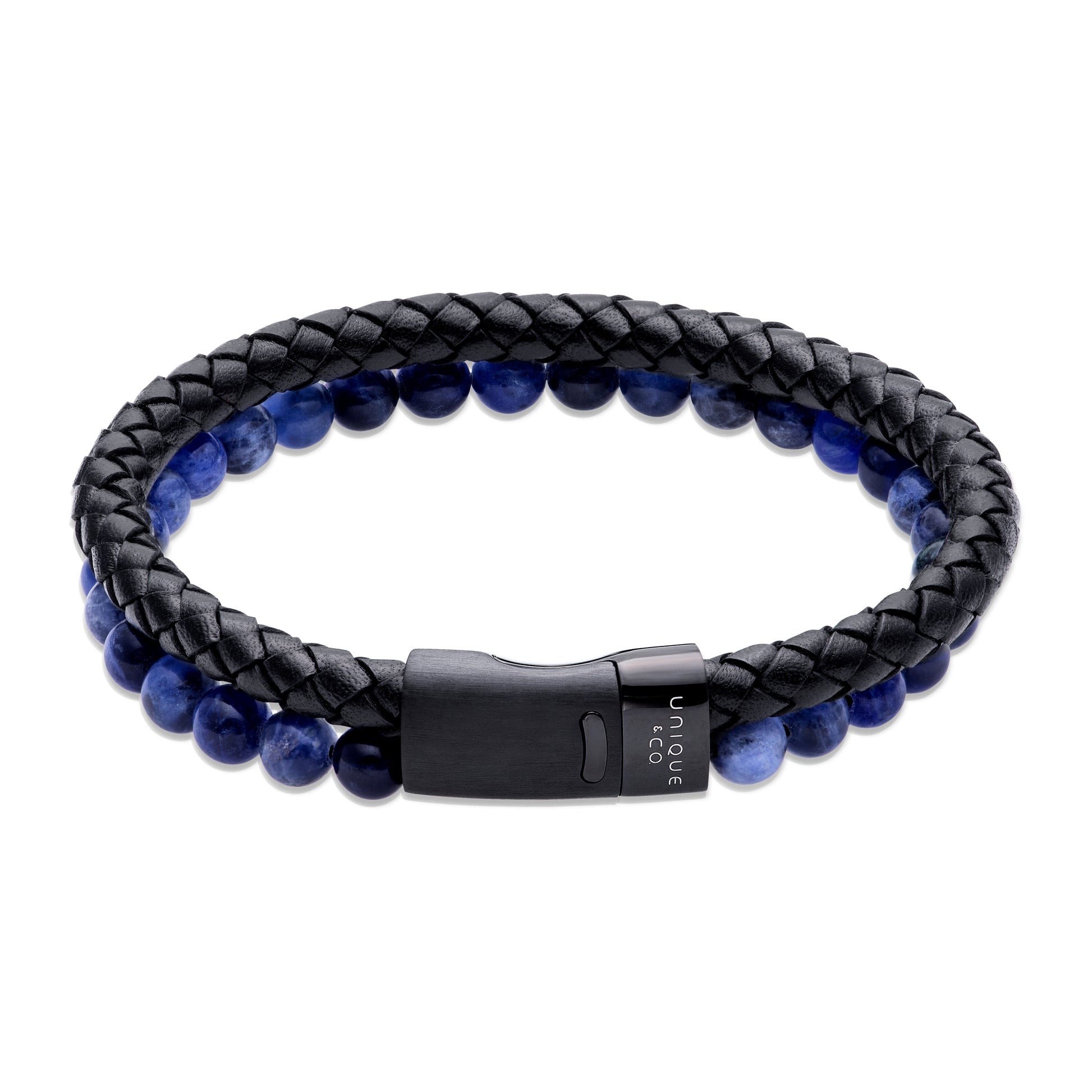 Braided black leather bracelet with blue beads and a black steel magnetic clasp. Bracelet length is 21cm.