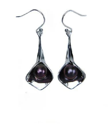 Large organic lily black fresh water pearl drop earrings.