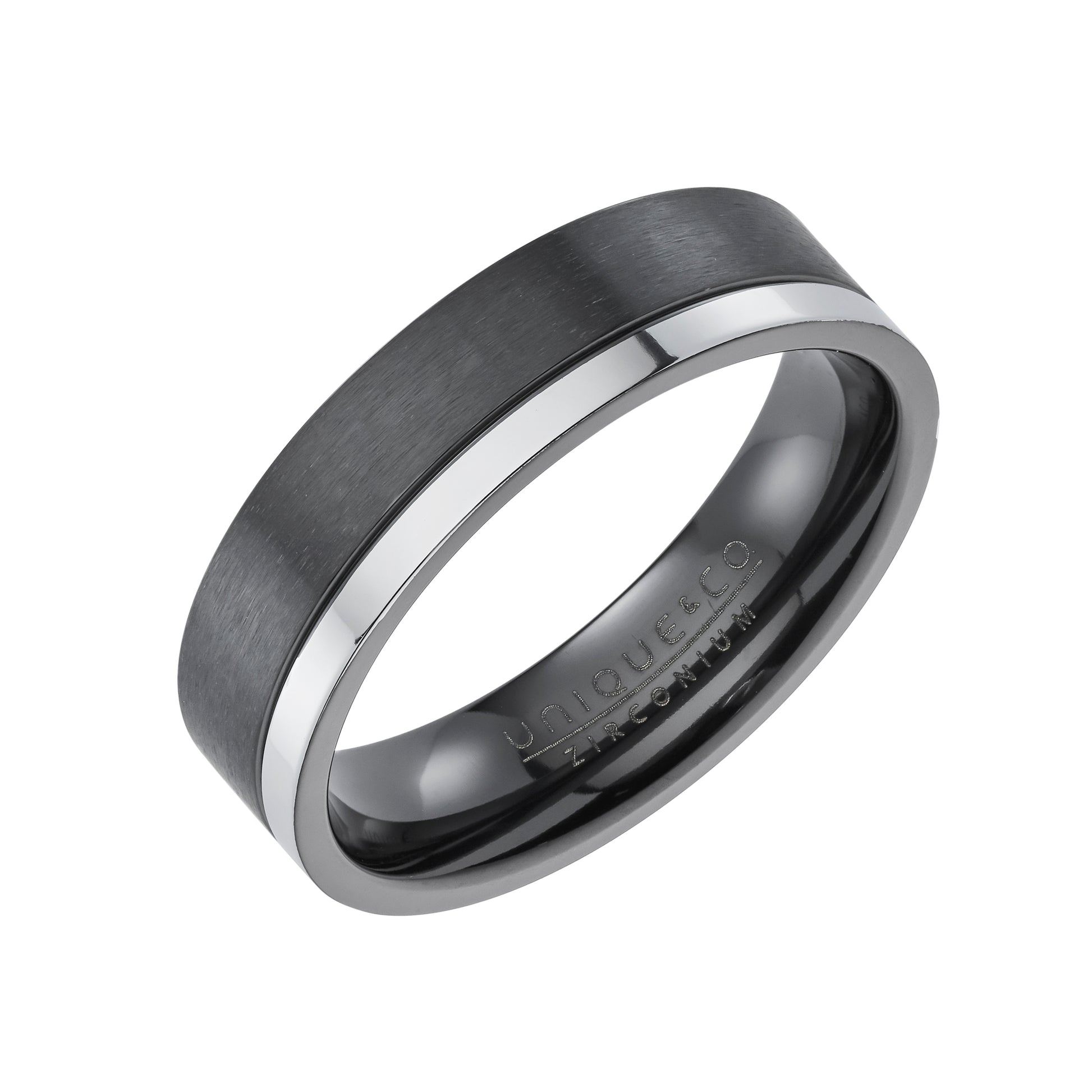 6mm Zirconium ring in a matte finish with a polished silver IP edge.