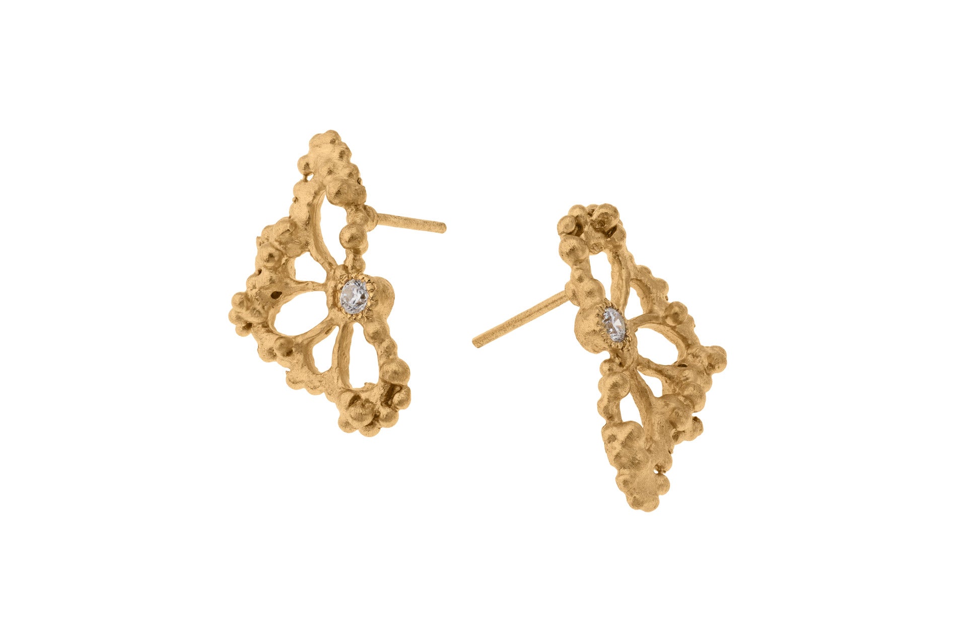 Elisabeth silver stud earrings in a yellow gold finish and set with a single cubic zirconia. 2x1cm. Handmade with a combination of modern design and traditional craftsmanship by Deco Echo.