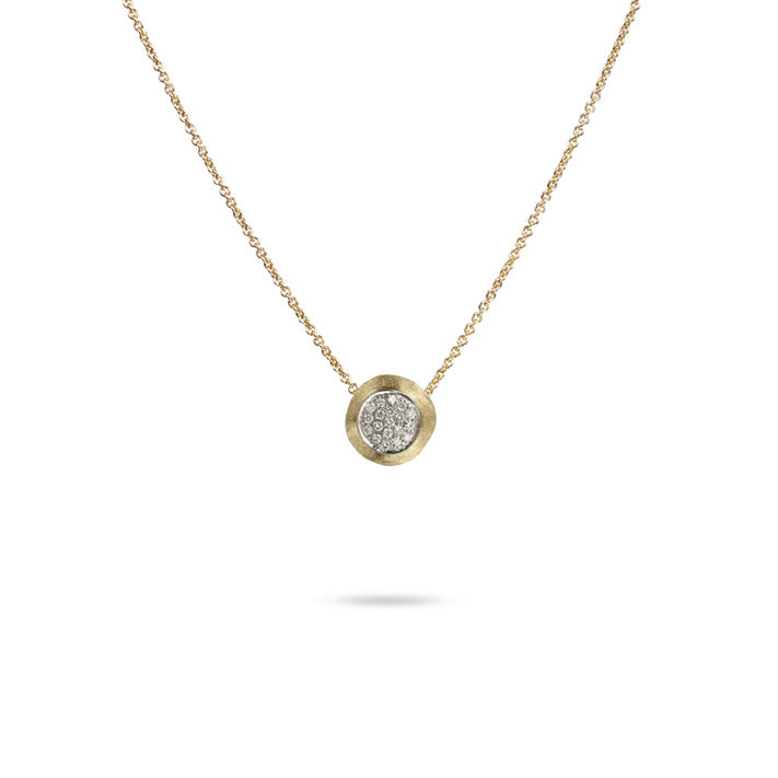 18kt yellow gold delicate necklace set with 0.15ct pave set diamonds. Hand engraved with the time-honoured bulino technique.