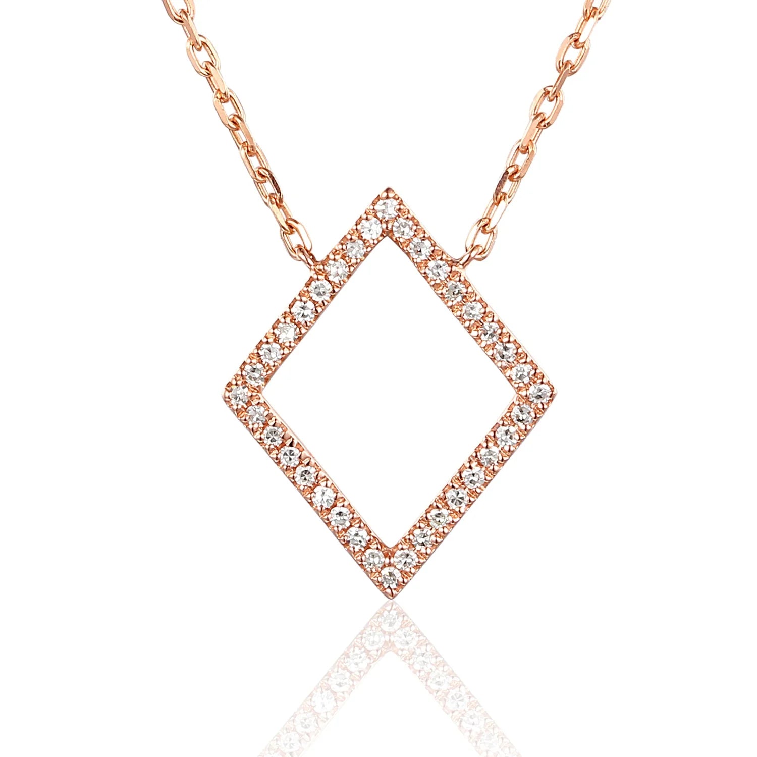 Rose gold diamond shape geometric delicate necklace set with fine diamonds around the edge, in 18ct rose gold