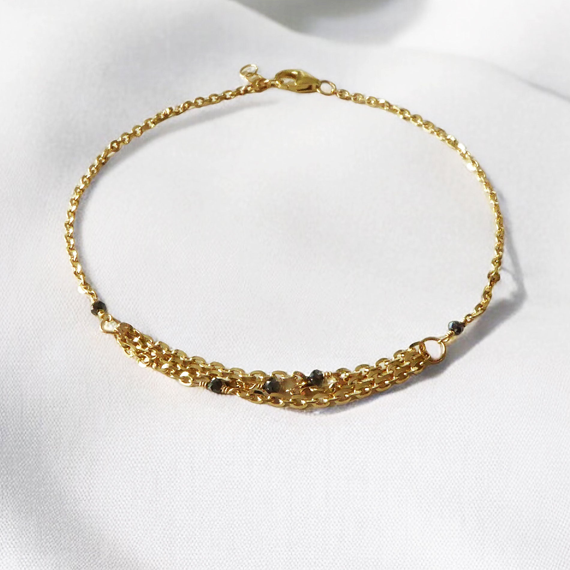9kt yellow gold 3 strand bracelet with black faceted diamonds