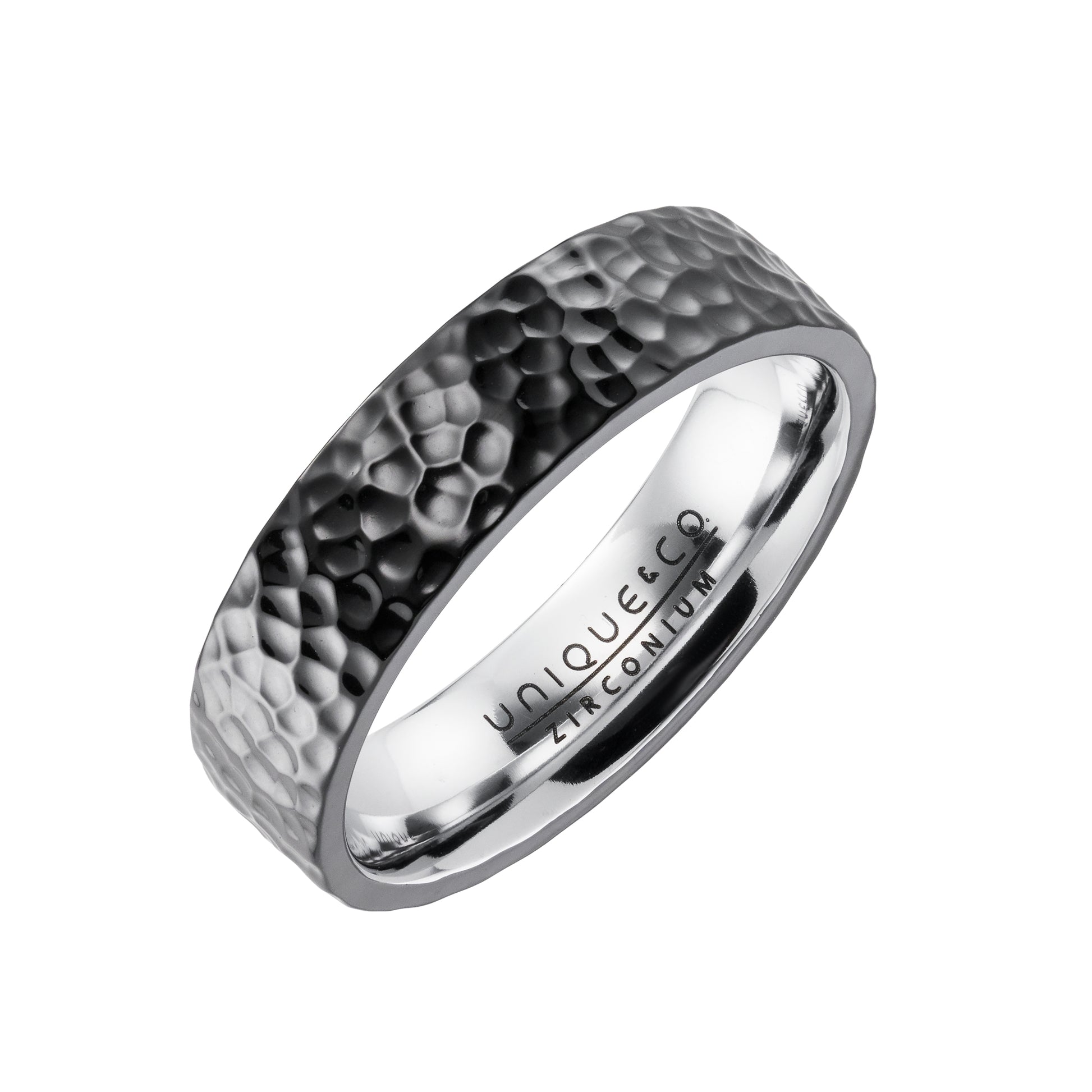 6mm Zirconium ring in a black hammered finish with a silver IP inside band.
