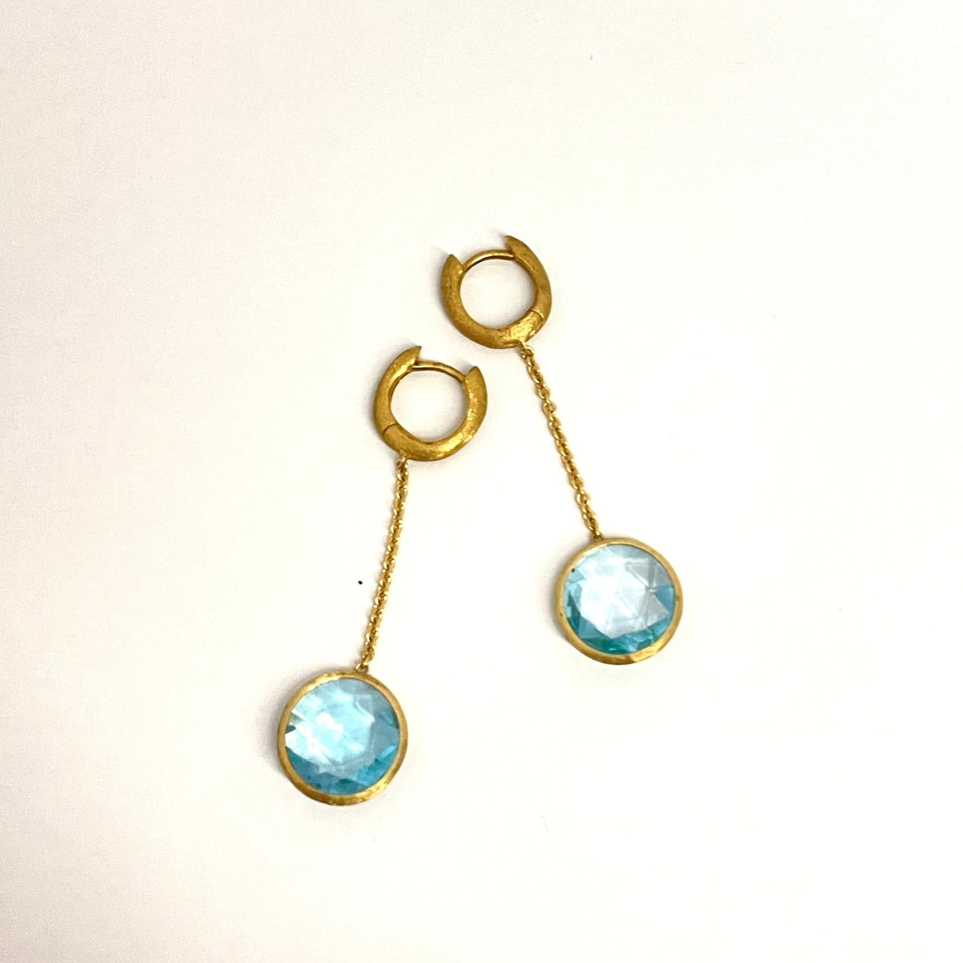 18ct yellow gold Jaipur drop chain earrings. Hand engraved with the time-honoured Bulino technique and set with London blue topaz.