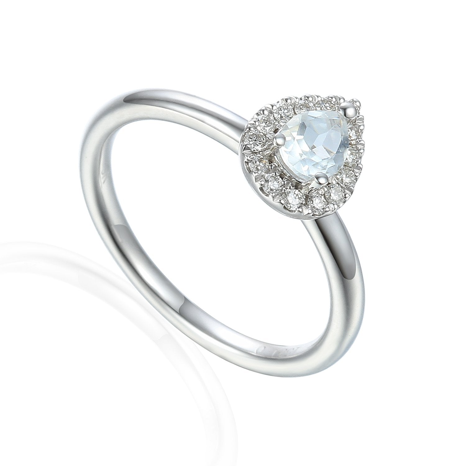 9k white gold ring set with pear shaped moonstone and diamond halo surround. Ring size is UK M.