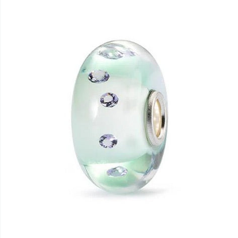 Meditative and green, a glass bead by Trollbeads to protect your heart. In this bead there are 10 lavender cubic zirconias embedded.