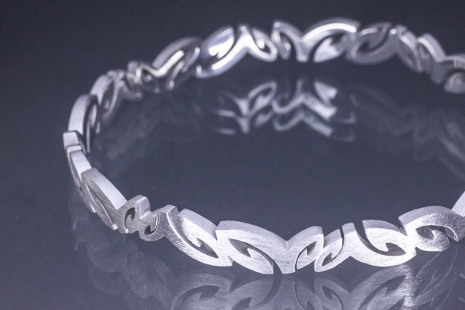 7cm wide silver abstract leaf design bangle.