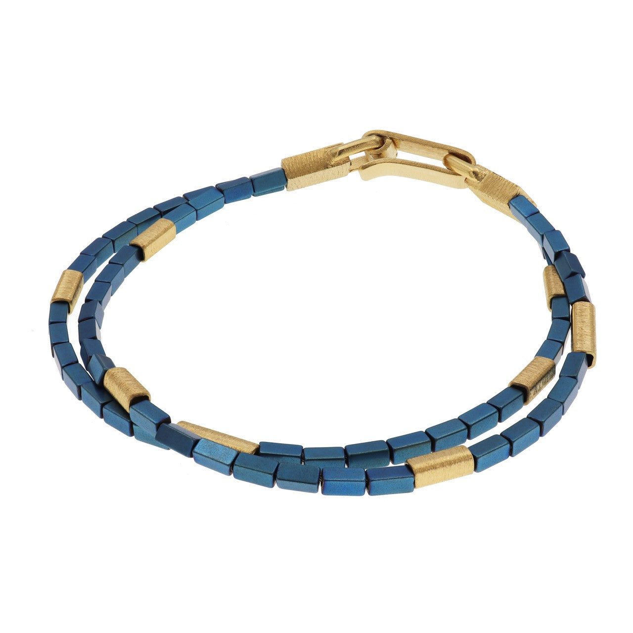 19cm two strand silver and blue hematite bracelet with a yellow gold finish. Handmade with a combination of modern design and traditional craftsmanship by Deco Echo.