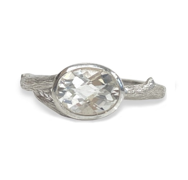 A slim 9ct silver ring with a twig design set with a oval white topaz.