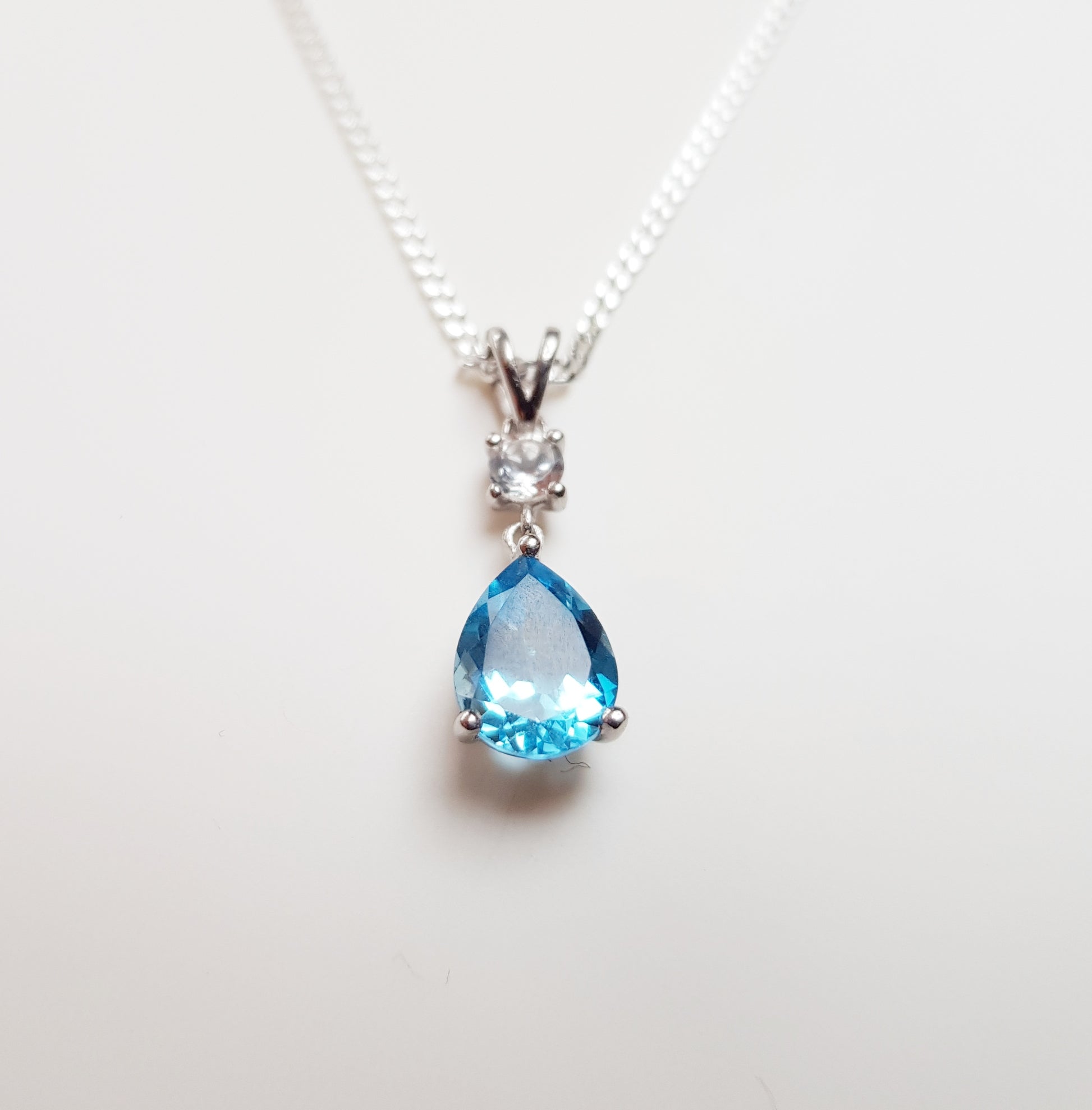 Sterling silver pendant claw set with pear shaped blue topaz that hangs beautifully from a single brilliant white quartz. Supplied on a 45cm silver chain.