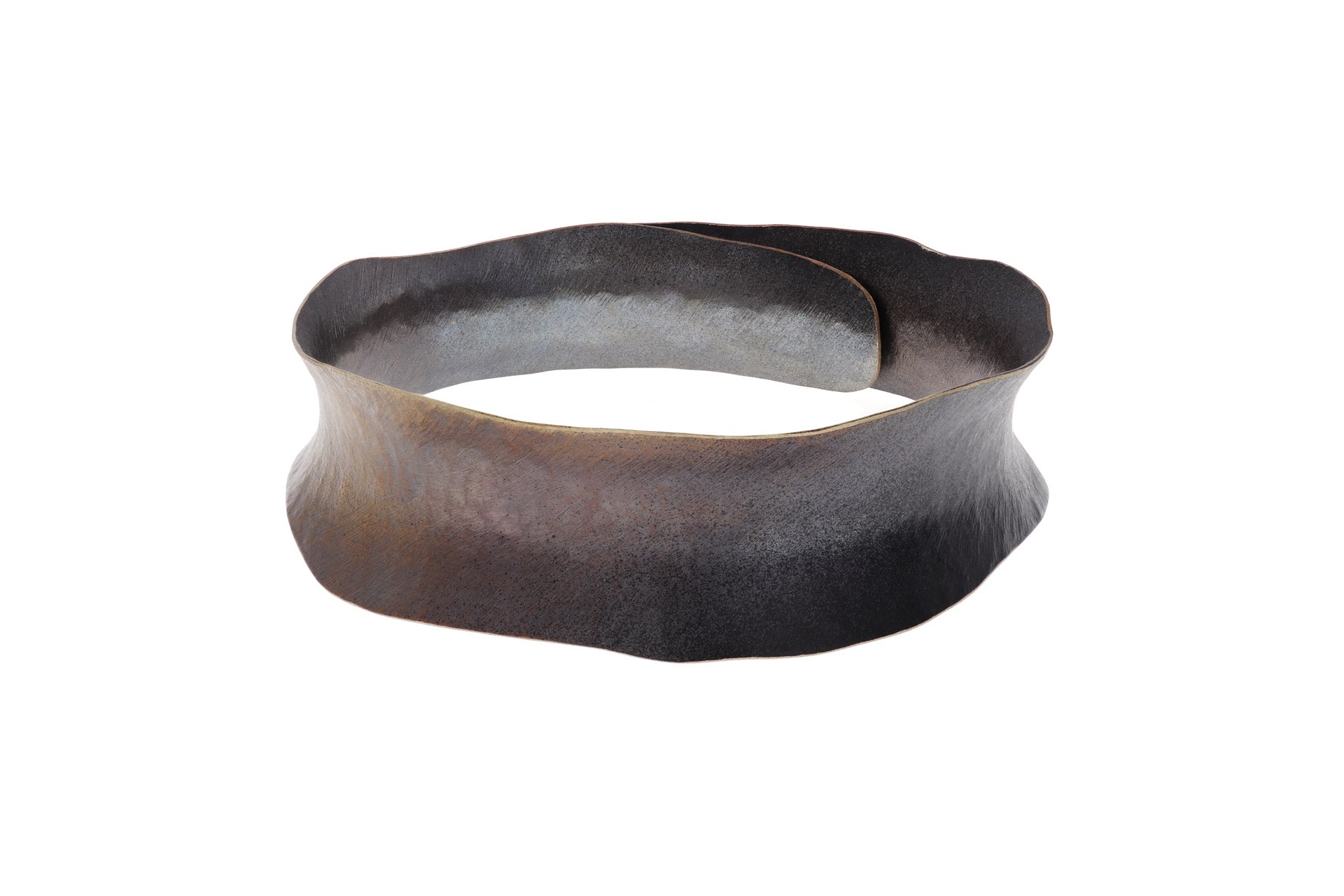 1.5cm wide silver concave bangle in a brown finish. Handmade with a combination of modern design and traditional craftsmanship by Deco Echo.