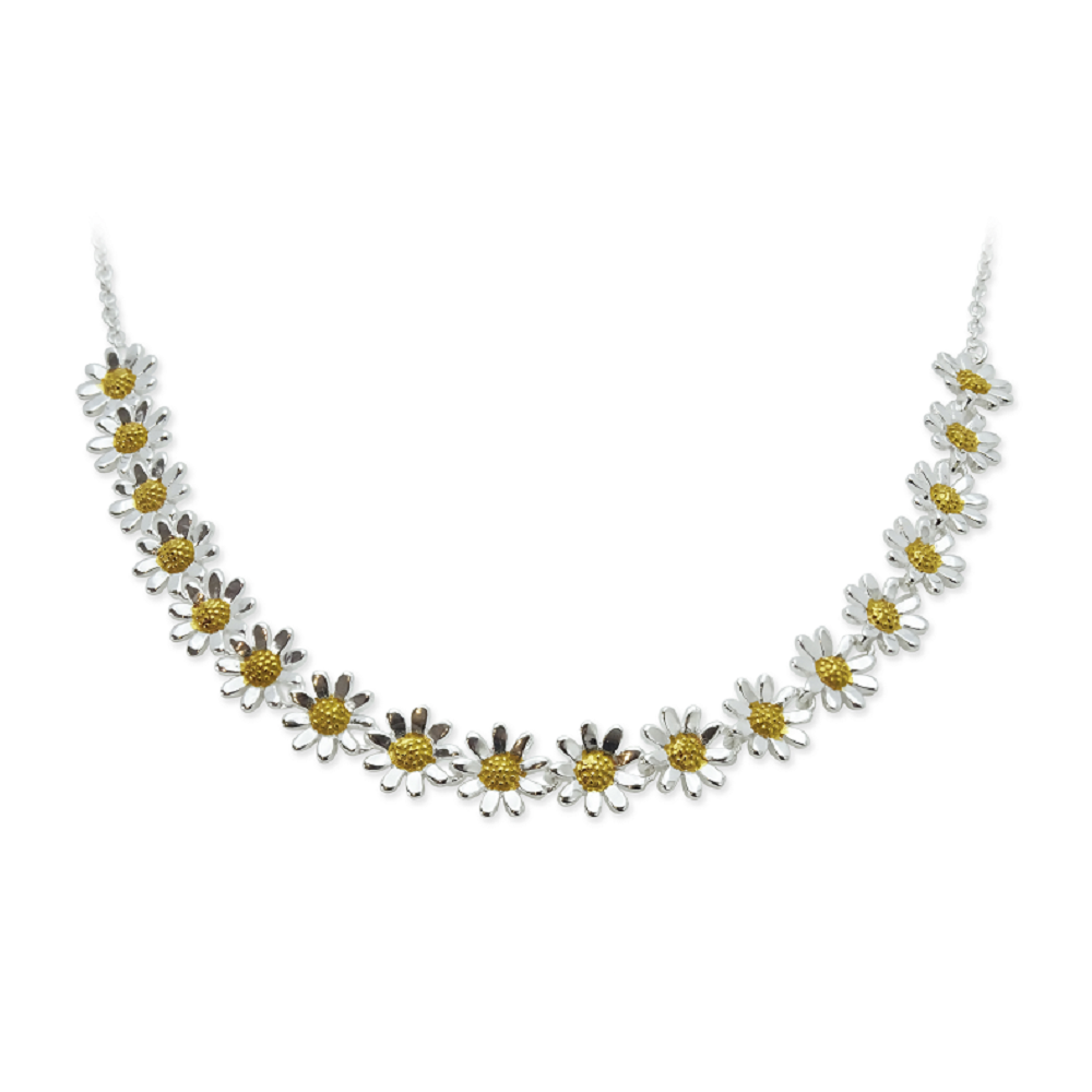 42cm silver necklace with a 3cm extender made up of 18 6mm daisys with a yellow gold finish center.