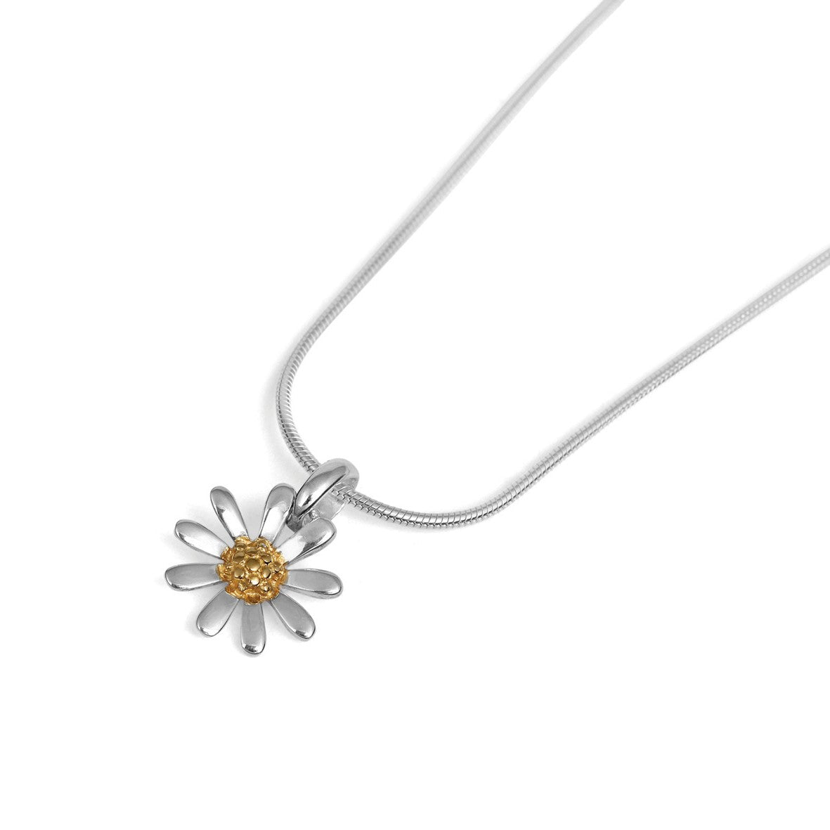 12mm silver daisy pendant with a yellow gold centre supplied on a 45cm silver chain.