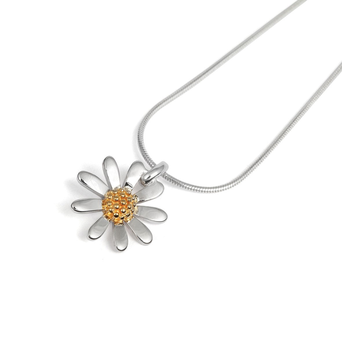 15mm silver daisy pendant with a yellow gold centre supplied on a 45cm silver chain.