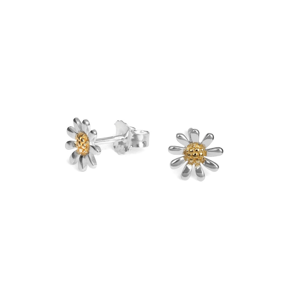 8mm silver daisy stud earrings with a yellow gold finish centre. A very popular gift idea.