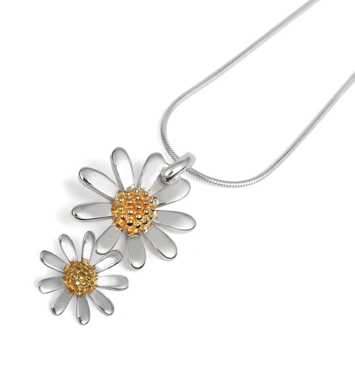 Silver double daisy pendant made up of a 18mm and 13mm silver daisy with a yellow gold finish centre supplied on a 45cm silver chain.