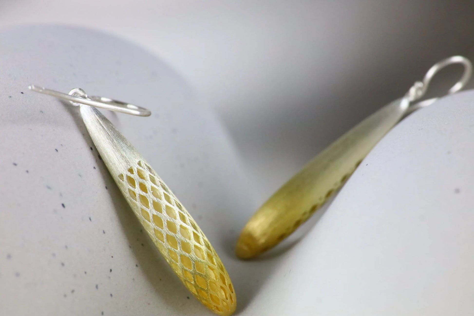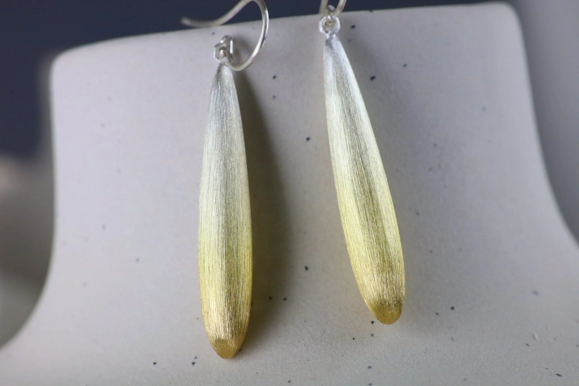 Silver and gold finished elongated drop earrings in a textured finish