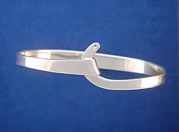 Sterling Silver handmade flat bangle with curved hook fastening.