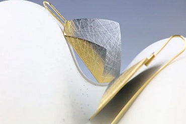 Silver folded oval design drop earring in a yellow gold and black rhodium finish.