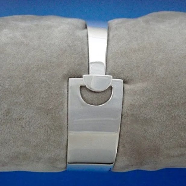 Sterling Silver handmade flat wide hook bangle.