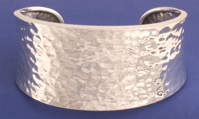 Silver medium polished cuff bangle with a hammered finish and slight concave design.