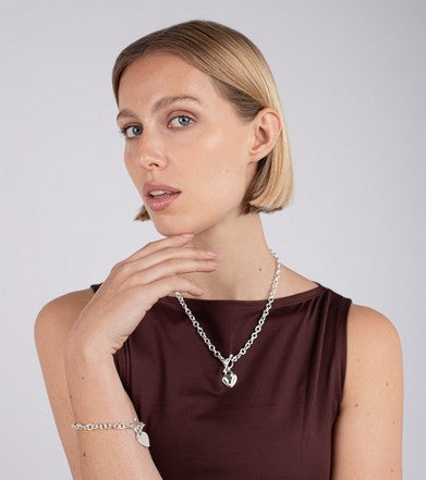 Sterling silver oval link necklace with a heart harm and t-bar fastening.
