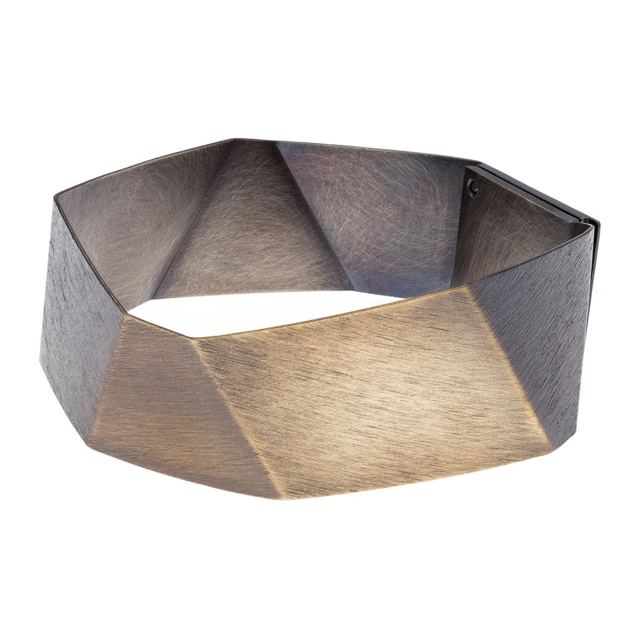 2.5cm silver origami style bangle with a magnetic clasp in a brown finish. Handmade with a combination of modern design and traditional craftsmanship by Deco Echo.