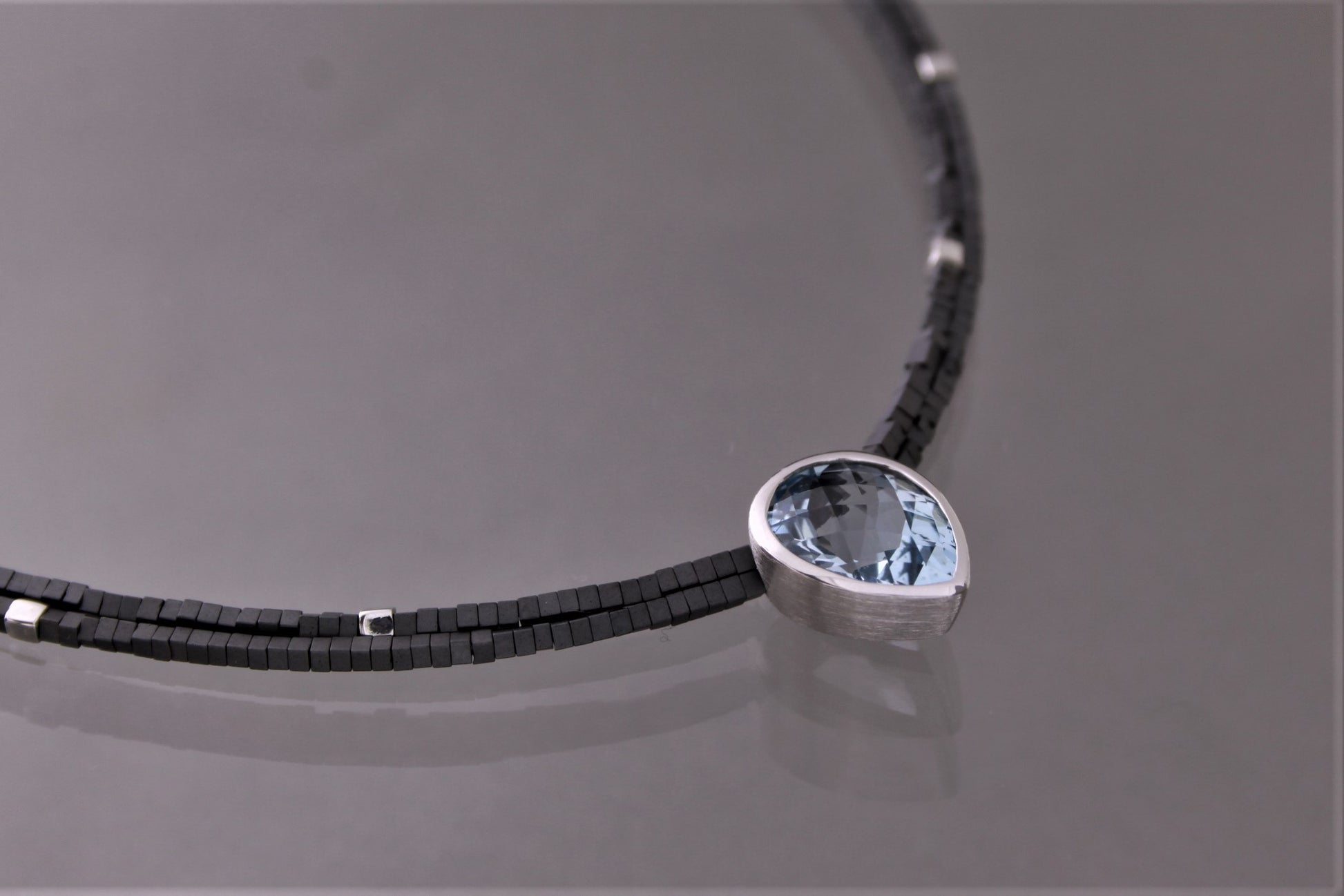 1.5cm silver pear shaped pendant set with blue topaz. Pendant is supplied on a 44cm silver two strand bead style chain in an oxidised and silver finish.
