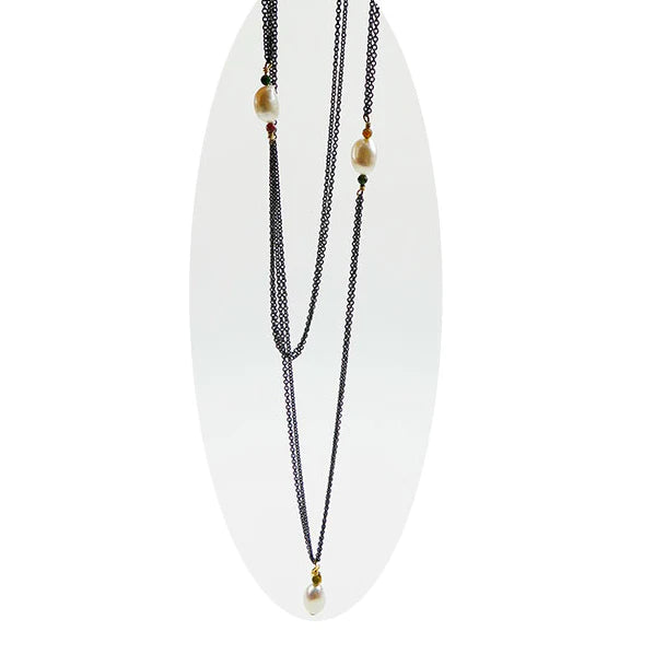45cm silver 2 strand necklace in an oxidised finish with 3 freshwater pearls and coloured agate stones. Designed and manufactured in Denmark by San.