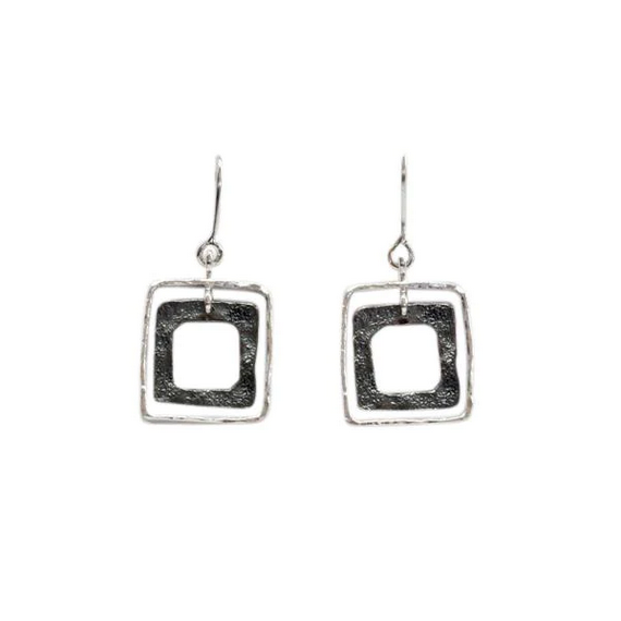 17mm silver articulated square drop earrings in a silver and oxidised mixed finish. Total length including hook is 36mm.