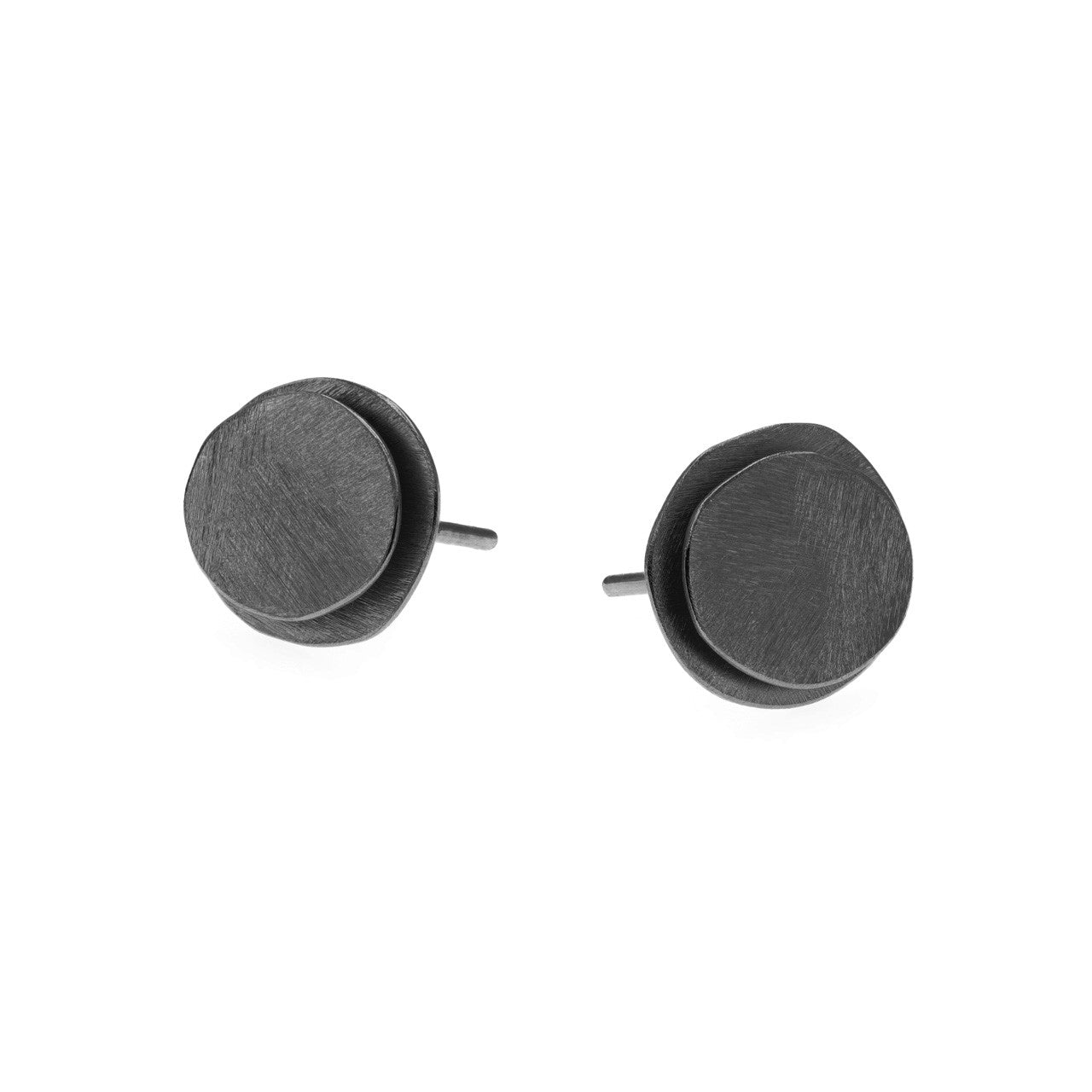 1cm round silver pebble stud earrings in an oxidised finish. Handmade with a combination of modern design and traditional craftsmanship by Deco Echo.