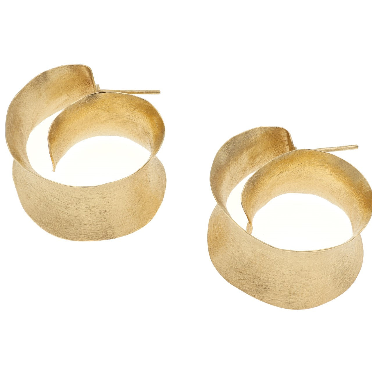 1.5cm wide silver concave hoop earrings in a yellow gold finish. Handmade with a combination of modern design and traditional craftsmanship by Deco Echo.