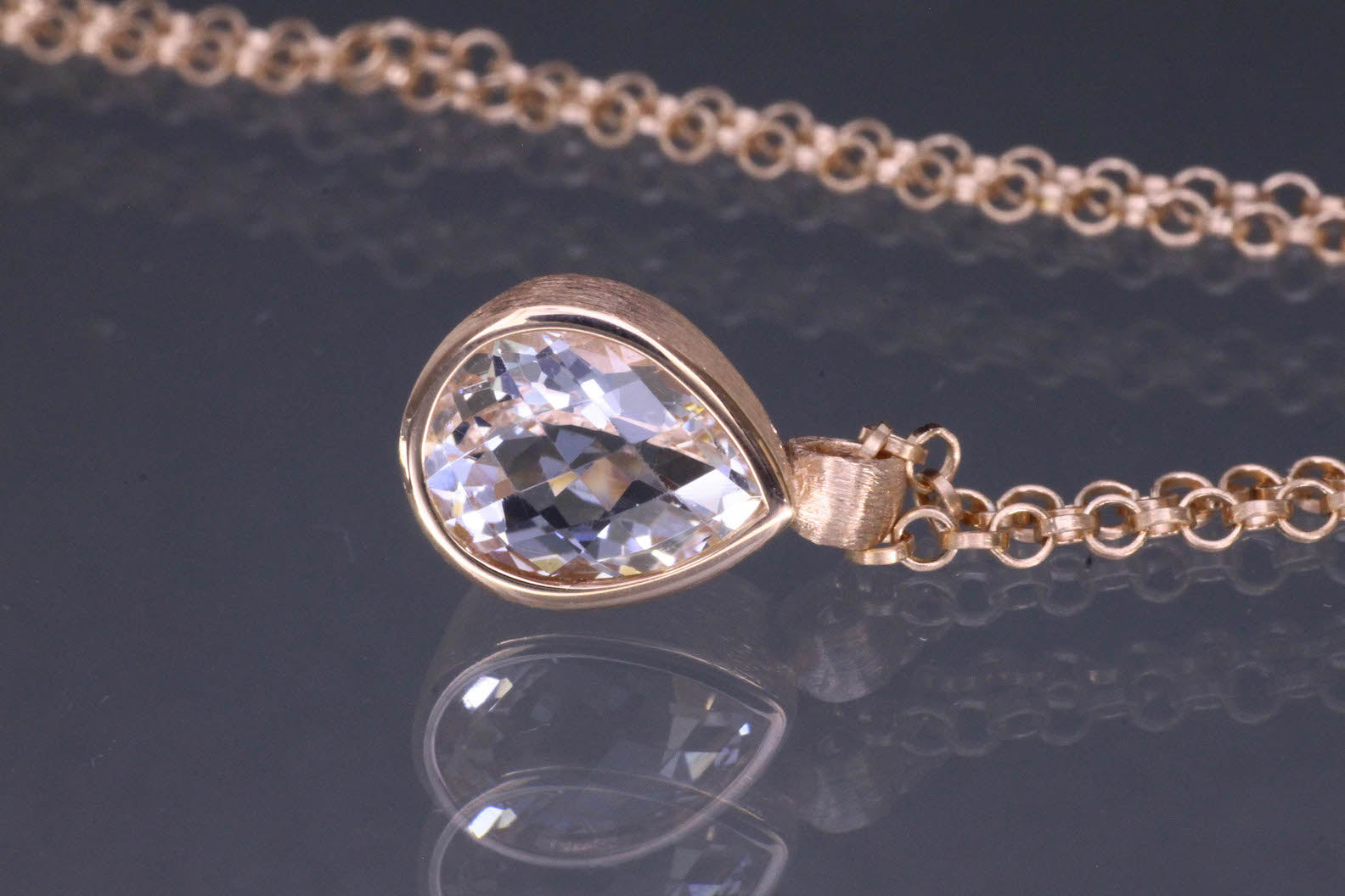 Sterling silver pendant in a rose gold finish, set with a pear shaped rock crystal. Pendant is supplied on a 43cm silver/rose gold chain.