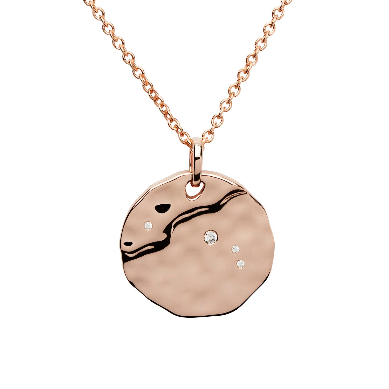 Silver lightly hammered pendant in a rose gold finish. This pendant is set with CZ stones representing the constellation of Aries. Supplied on a 45cm silver/RGP chain.