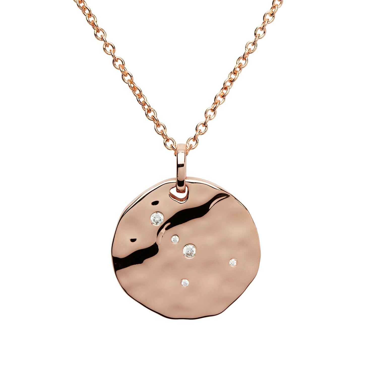 Silver lightly hammered pendant in a rose gold finish. This pendant is set with CZ stones representing the constellation of Cancer. Supplied on a 45cm silver/RGP chain.