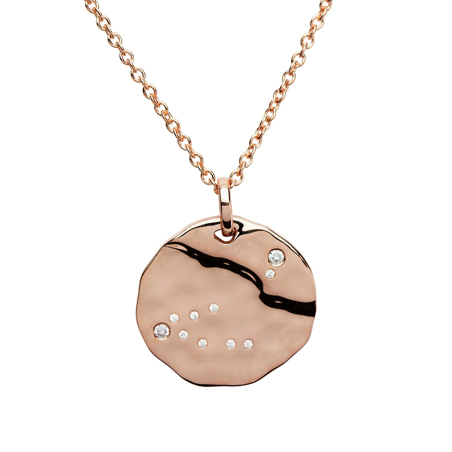 Silver lightly hammered pendant in a rose gold finish. This pendant is set with CZ stones representing the constellation of Capricorn. Supplied on a 45cm silver/RGP chain.
