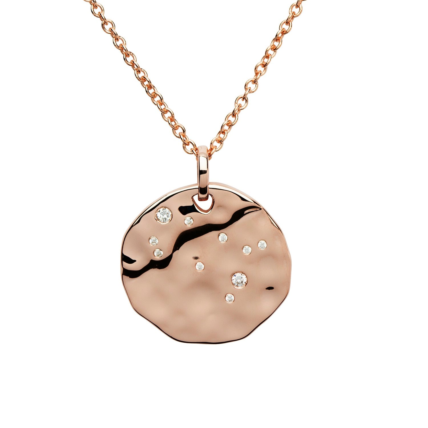 Silver lightly hammered pendant in a rose gold finish. This pendant is set with CZ stones representing the constellation of Gemini. Supplied on a 45cm silver/RGP chain.