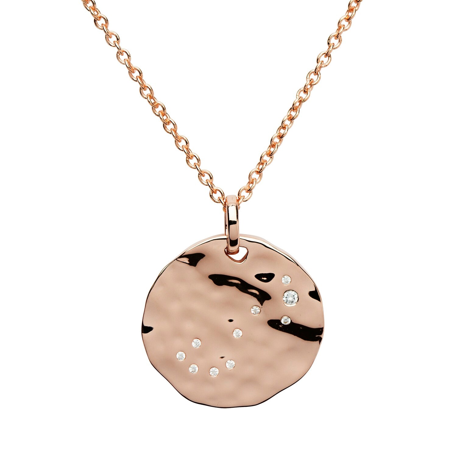 Silver lightly hammered pendant in a rose gold finish. This pendant is set with CZ stones representing the constellation of Scorpio. Supplied on a 45cm silver/RGP chain.