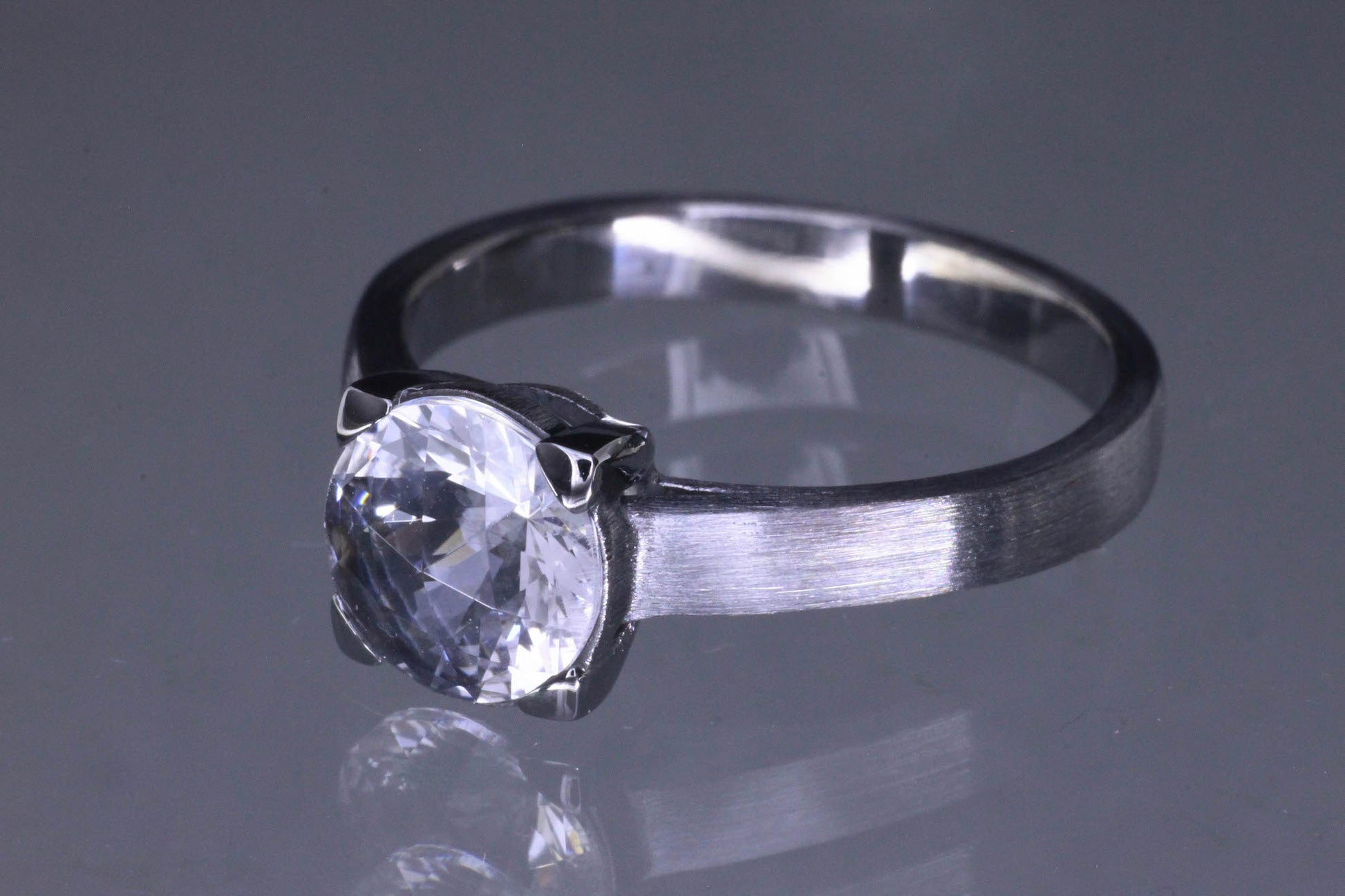 Sterling silver ring in a black rhodium finish, set with a round rock crystal. Ring is a size O.