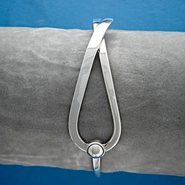 Sterling Silver handmade bangle with large tear shape ball end hook.
