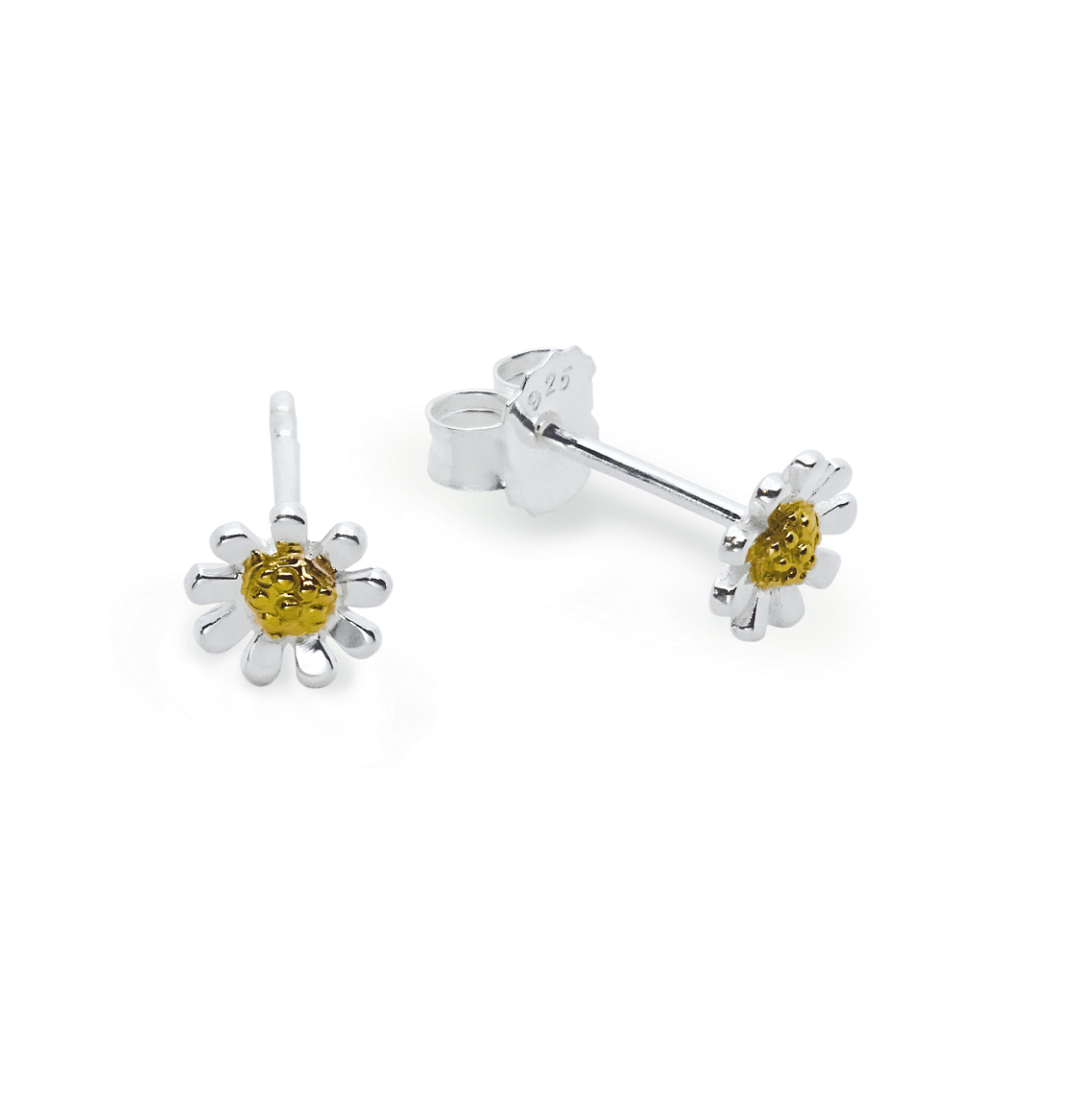6mm silver daisy stud earrings with a yellow gold finish centre. A popular gift idea.