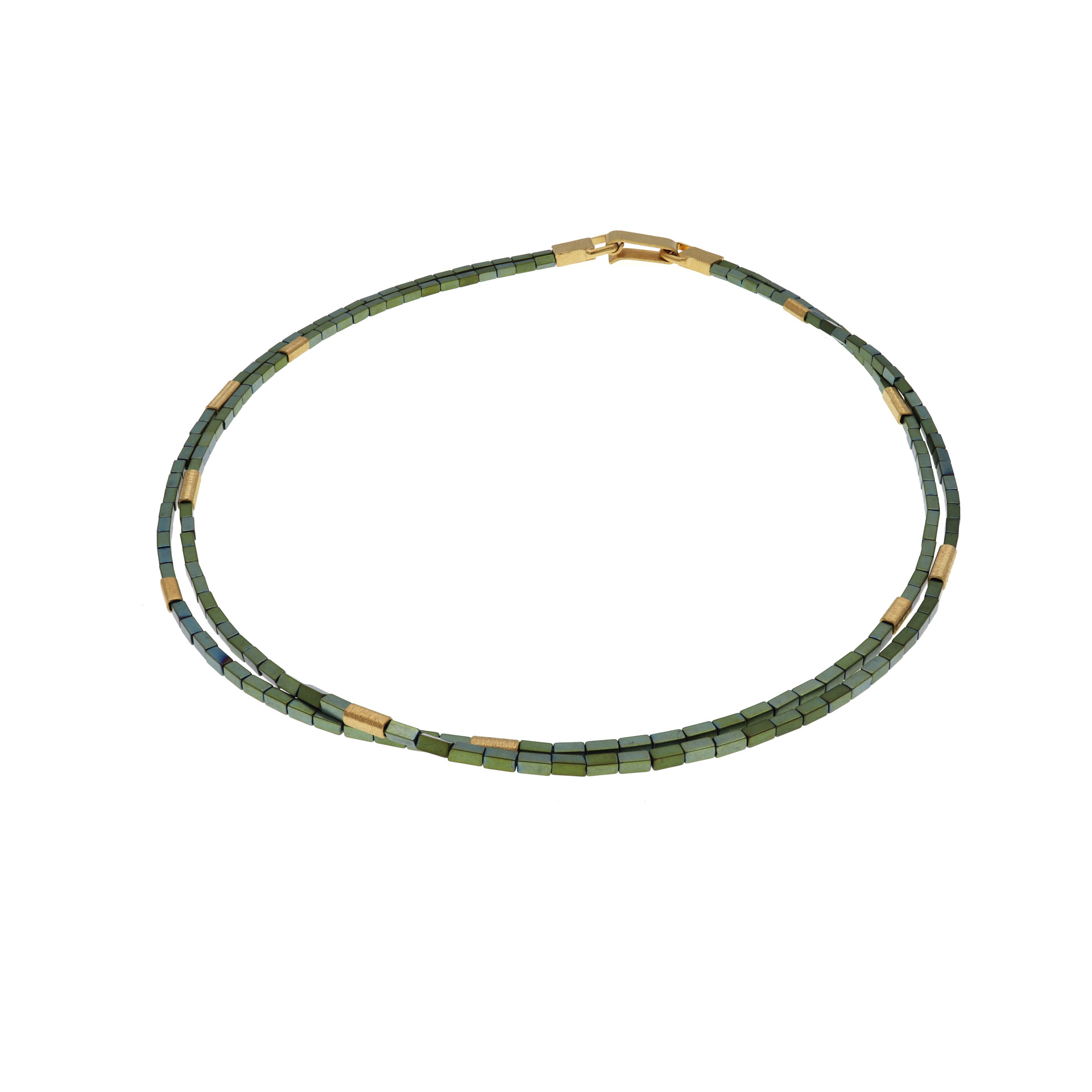 45cm silver and green hematite two strand necklace with a yellow gold finish. Handmade with a combination of modern design and traditional craftsmanship by Deco Echo.