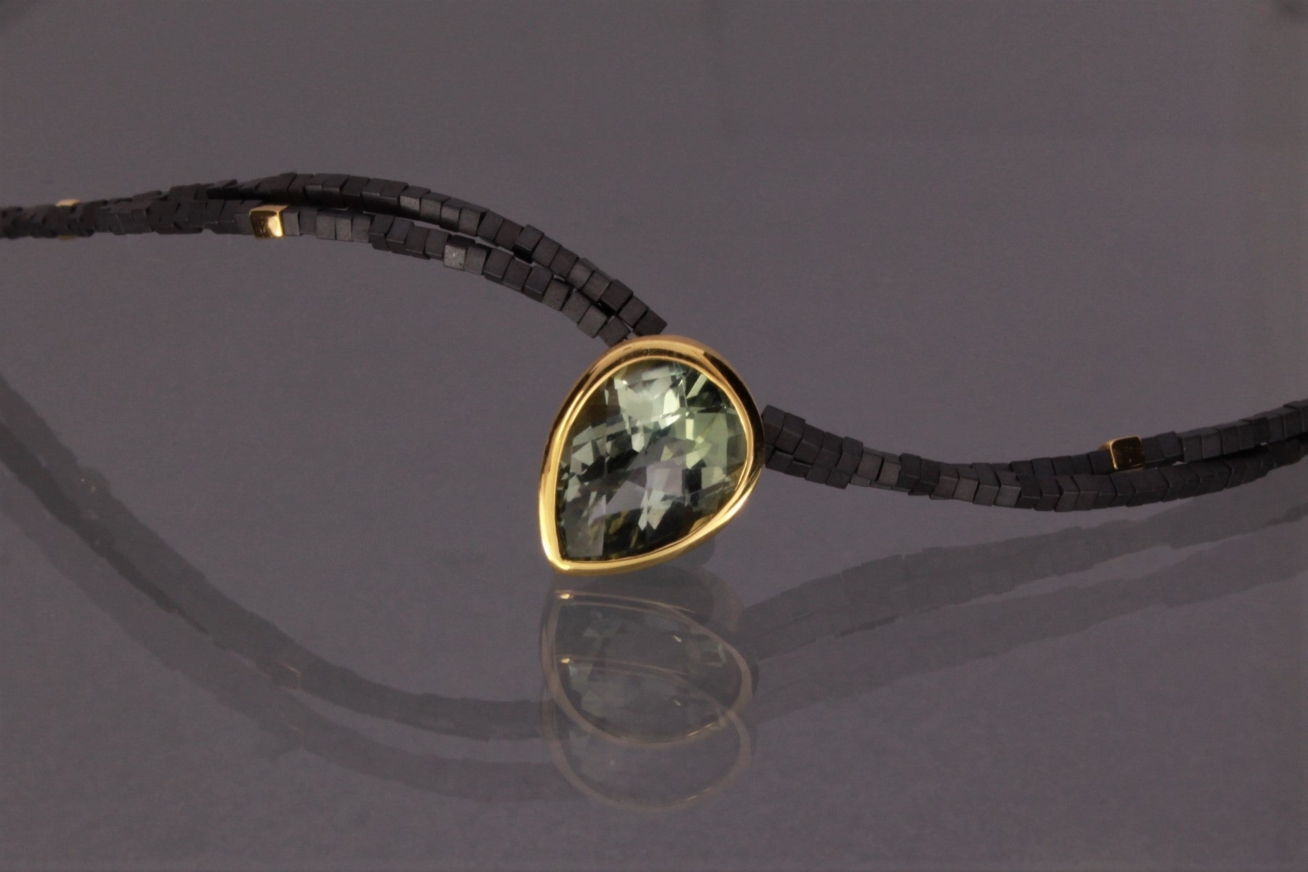 1.5cm silver pear shaped pendant set with a green amethyst in a yellow gold finish. Pendant is supplied on a 44cm silver two strand bead style chain in an oxidised and yellow gold finish.