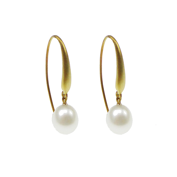 Silver drop earrings in a matte yellow gold finish with a freshwater pearl.