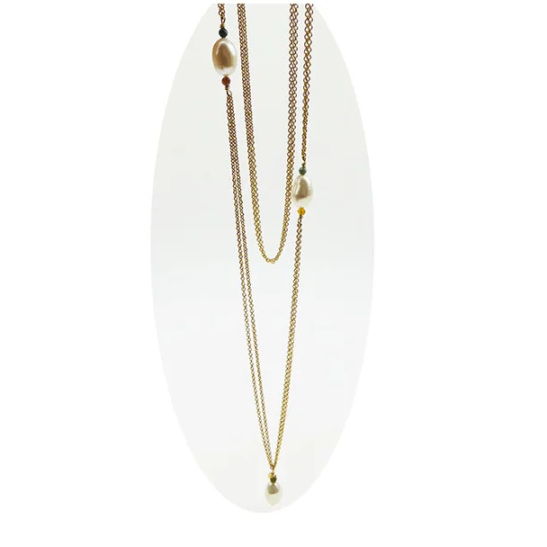 80cm silver 2 strand necklace in a yellow gold finish with 3 freshwater pearls and coloured agate stones. Designed and manufactured in Denmark by San.