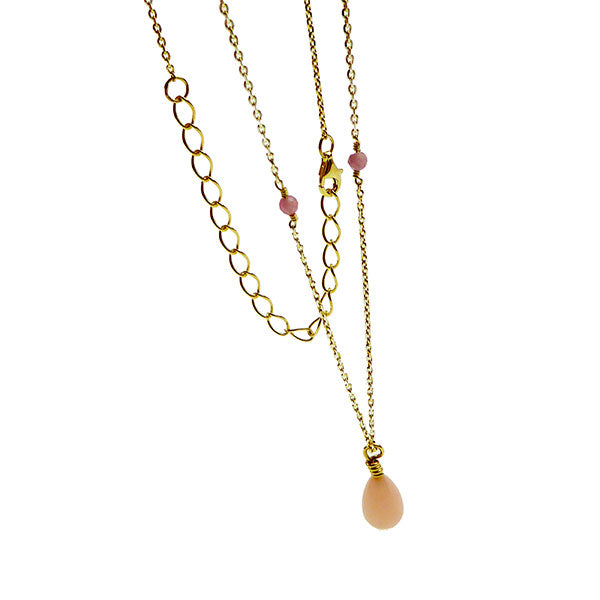 42cm silver chain necklace in a yellow gold finish with a pink opal pendant and 8cm extender. Designed and manufactured in Denmark by San.